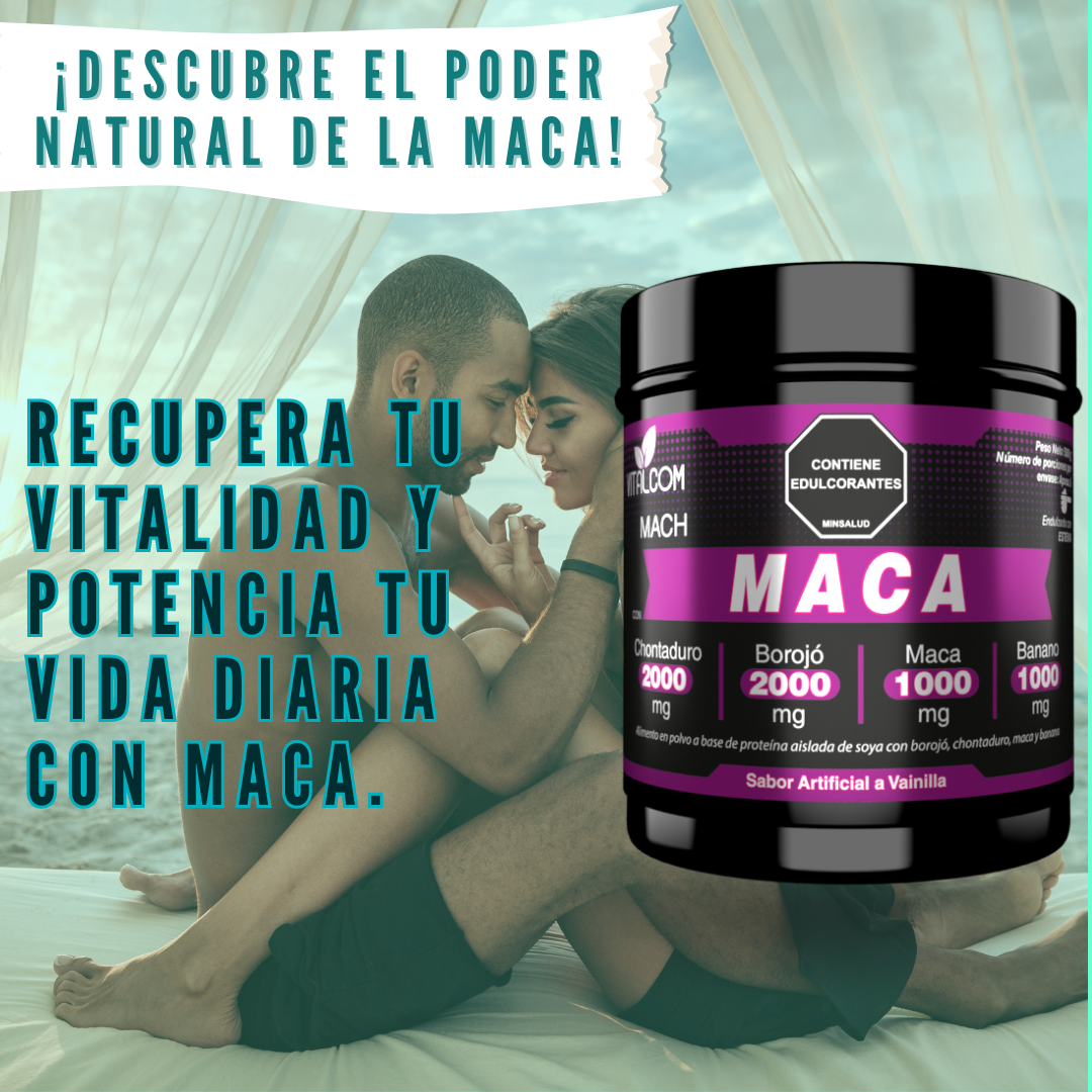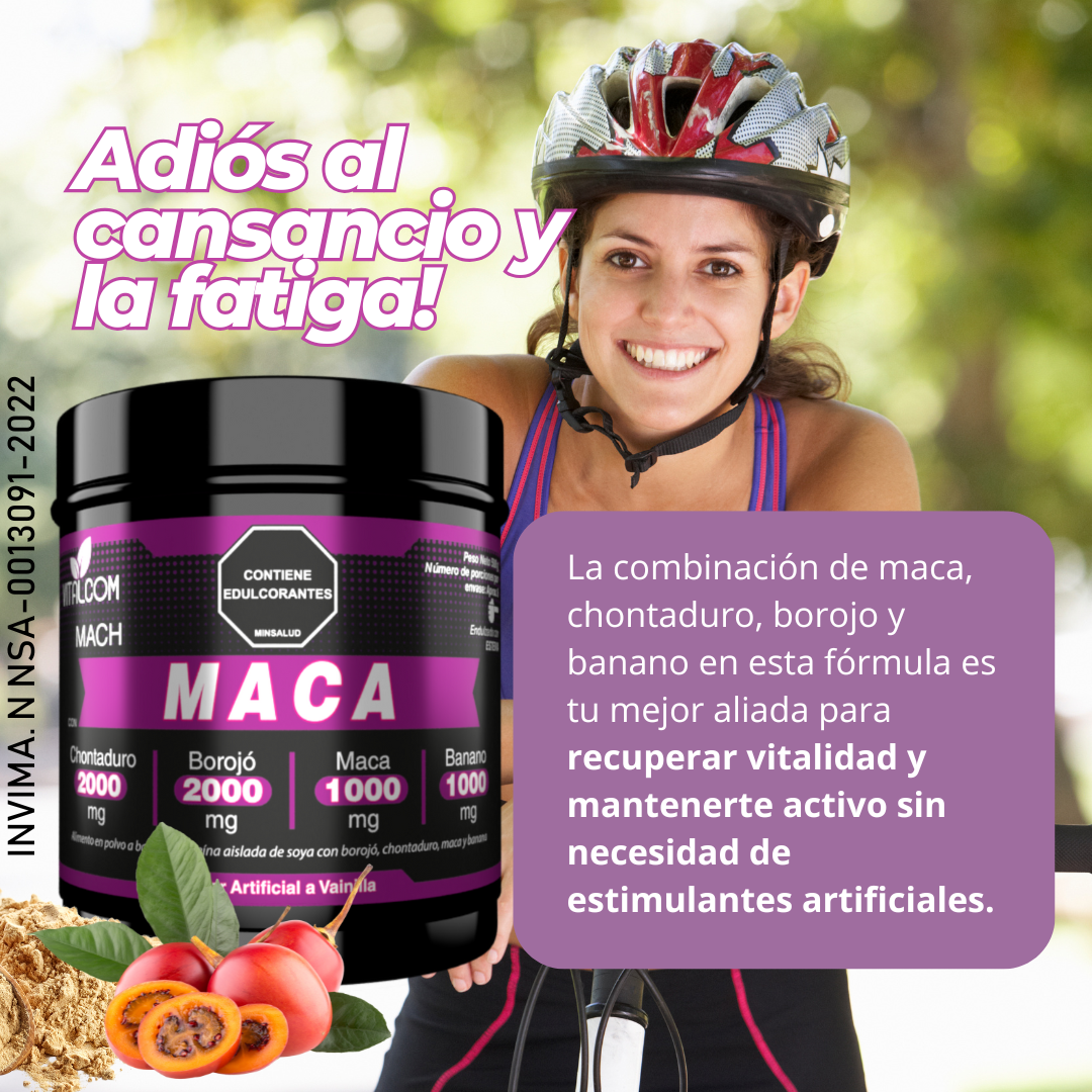 MACH es un alimento en polvo formulado con maca, chontaduro, borojó y banano, ideal para apoyar la energía, el desempeño físico, la vitalidad y el rendimiento diario.